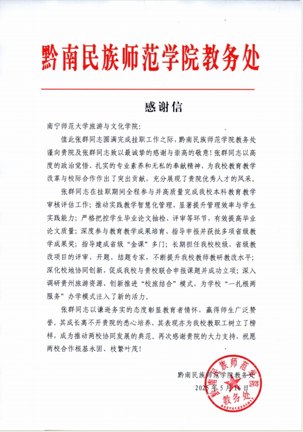 近日,黔南民族师范公司教务处向太阳成集团tyc122cc发出感谢信,对张群教授参与教育部师范教育协同提质计划,赴黔南民族师范公司挂职期间的突出贡献表示诚挚感谢与崇高敬意。