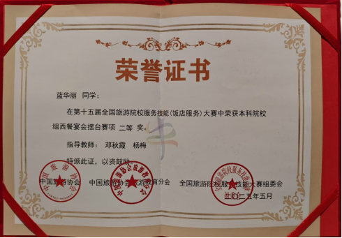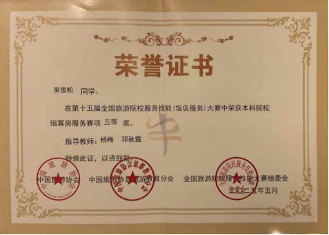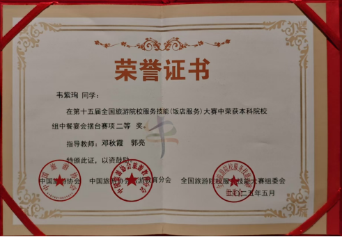 5月14日至18日在郑州盛大举办的第十五届全国旅游院校服务技能(饭店服务)大赛中,公司太阳成集团tyc122cc的3位参赛选手凭借卓越表现脱颖而出,在全国众多强手中崭露头角,为公司赢得了荣誉。其中,蓝华丽同学在本科院校组西餐宴会摆台赛项中荣获二等奖,韦紫珣同学在本科院校组中餐宴会摆台赛项中斩获二等奖,吴俊松同学在本科院校组客房服务赛项中获得三等奖。