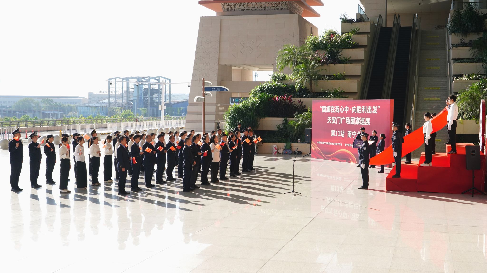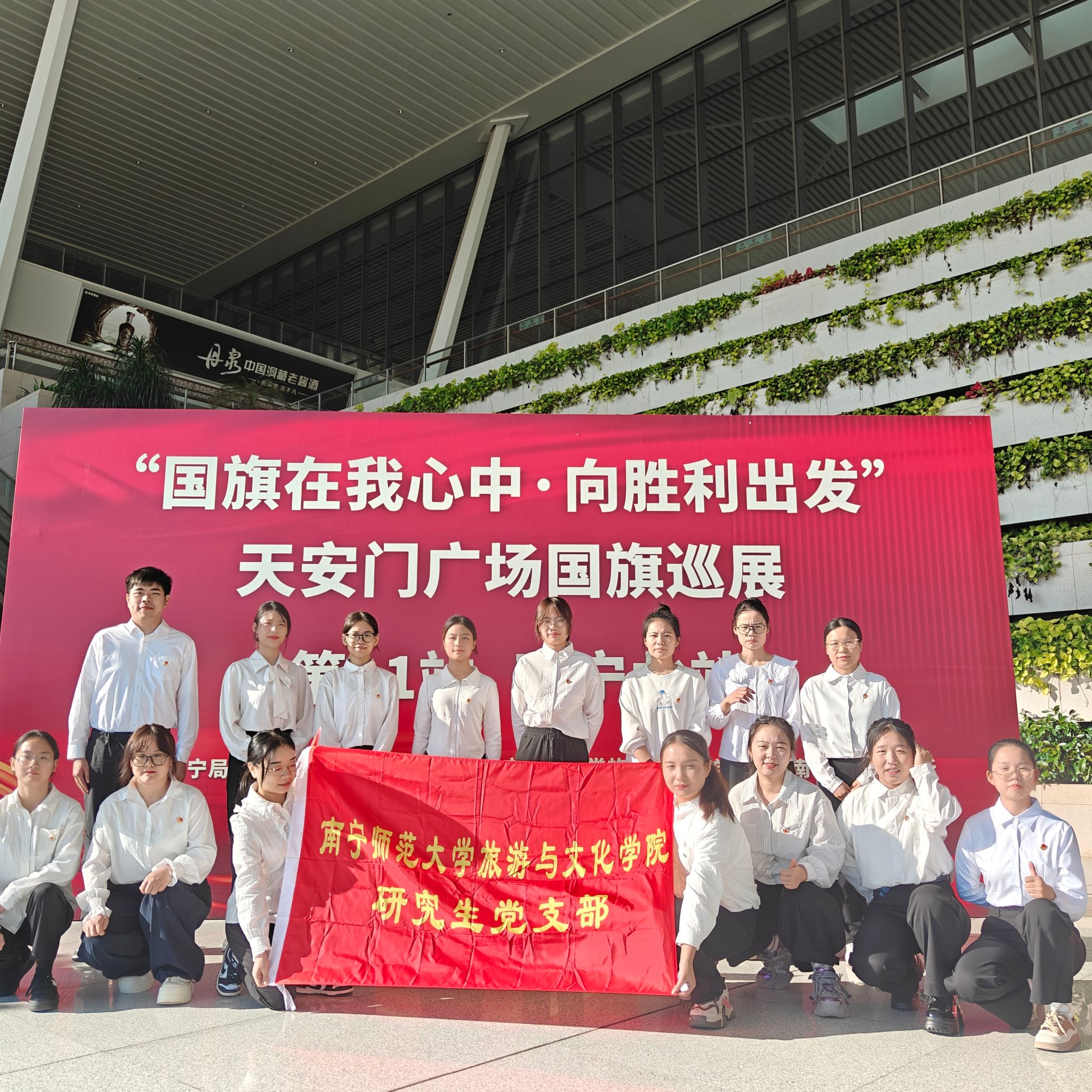 为深入学习贯彻党的二十届四中全会精神,厚植研究生党员爱国主义情怀,强化党建联盟单位协同育人实效,11月14日上午,太阳成集团tyc122cc党委副书记黄珍、研究生党支部书记陈春容带领支部成员,赴南宁北站落客平台,与南宁车站、南宁北站派出所等党建联盟单位共同参与“国旗在我心中——向胜利出发”天安门广场国旗巡展第11站(南宁北站)爱国主义教育活动,在庄重仪式与深度互动中传承红色基因,凝聚旅文学子奋进力量。